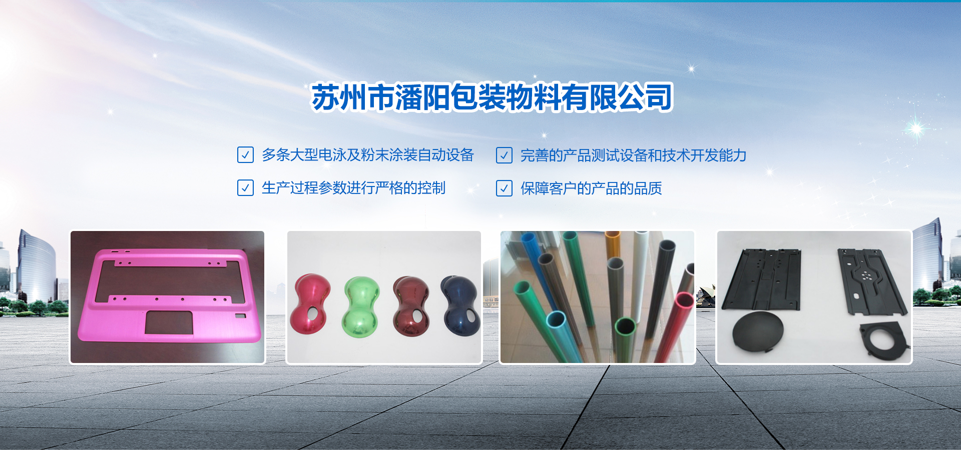 蘇州市潘陽包裝物料有限公司創(chuàng)建于2002年4月。坐落于美麗的蘇州相城。占地面積8000㎡,目前公司人員約150人,技術(shù)及管理人員約30余人。 專業(yè)從事彩色、黑色粉末涂裝及電泳等表面處理加工服務(wù)。公司現(xiàn)有多條大型電泳及粉末涂裝自動設(shè)備,并有完善的產(chǎn)品測試設(shè)備和技術(shù)開發(fā)能力,對生產(chǎn)過程參數(shù)進(jìn)行嚴(yán)格的控制,從而保障了客戶的產(chǎn)品的品質(zhì)。公司已通過TS16949、ISO14000體系認(rèn)證,已經(jīng)與亞太和歐美地區(qū)的廣大客戶建立緊密的業(yè)務(wù)合作關(guān)系。